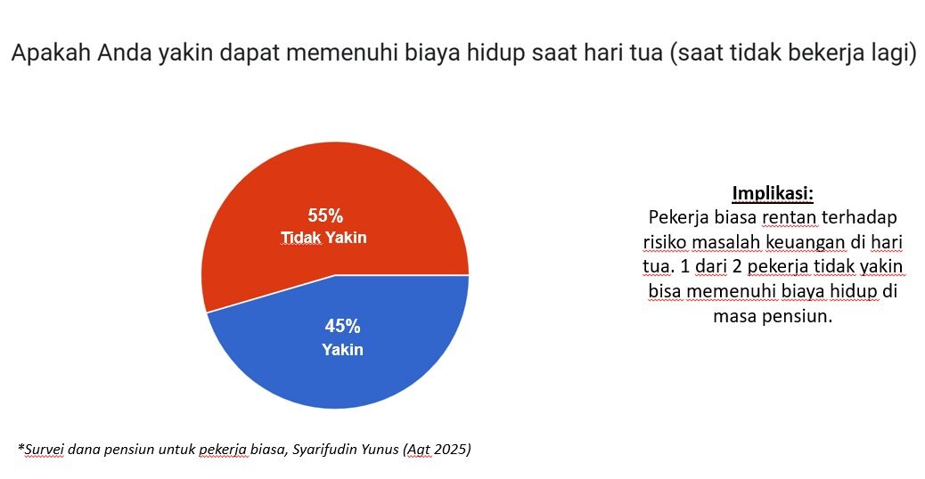 “Penelitian ini saya lakukan untuk mengetahui seberapa siap pekerja di Jabodetabek menghadapi pensiun. Ternyata, 55% tidak siap, bahkan tidak punya gambaran mau seperti apa hidup di hari tua. Padahal sebenarnya mereka punya kemampuan menabung. Mereka hanya takut miskin di masa tua,” ungkap Syarifudin saat merilis temuannya, Kamis (28/8/2025).