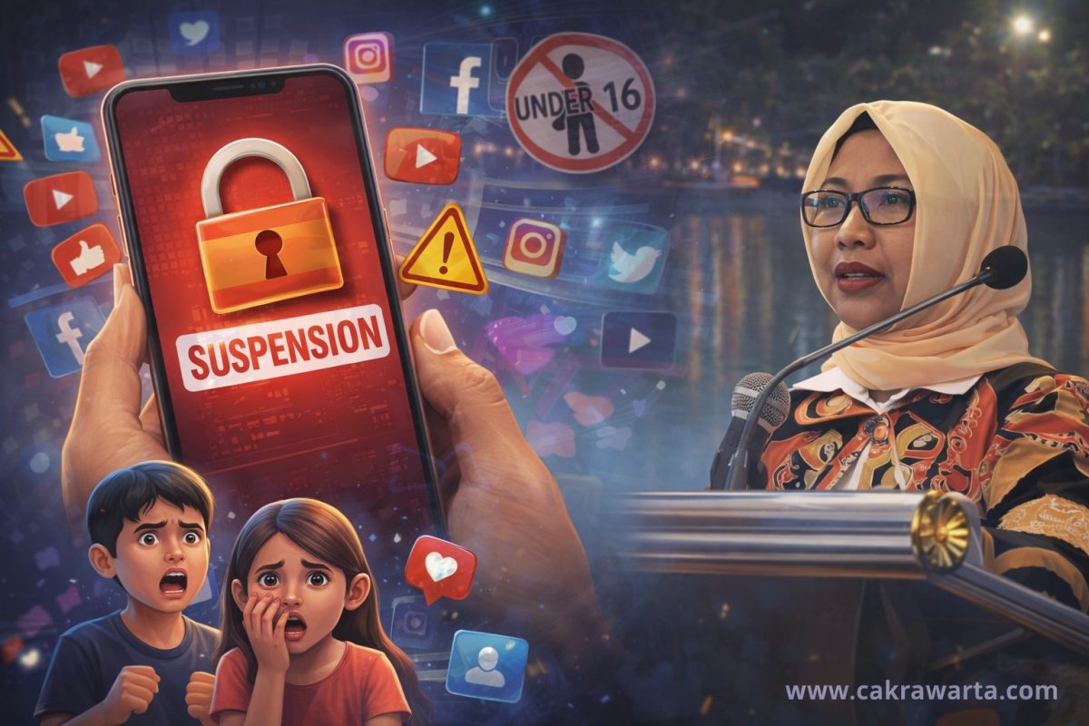 SURABAYA, CAKRAWARTA.com – Pemerintah melalui Kementerian Komunikasi dan Digital (Komdigi) menerbitkan Peraturan Menteri Komunikasi dan Digital (Permen Komdigi) Nomor 9 Tahun 2026 yang mengatur pembatasan atau penangguhan akun media sosial bagi anak berusia di bawah 16 tahun. Kebijakan ini dimaksudkan untuk melindungi anak dari berbagai konten digital yang berpotensi berdampak negatif terhadap perkembangan mereka.