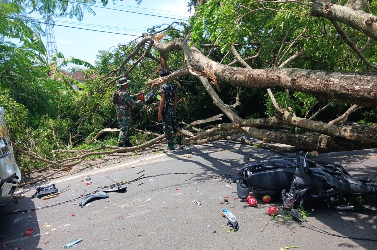 Pohon yang roboh tepat di tengah badan jalan tersebut menimpa sejumlah kendaraan yang sedang melintas, di antaranya sebuah truk bermuatan pasir, satu mobil, dan sepeda motor milik warga. Selain merusak kendaraan, kejadian itu juga memutus jaringan kabel listrik di sekitar lokasi, sehingga kondisi jalan dinilai rawan bagi pengguna.