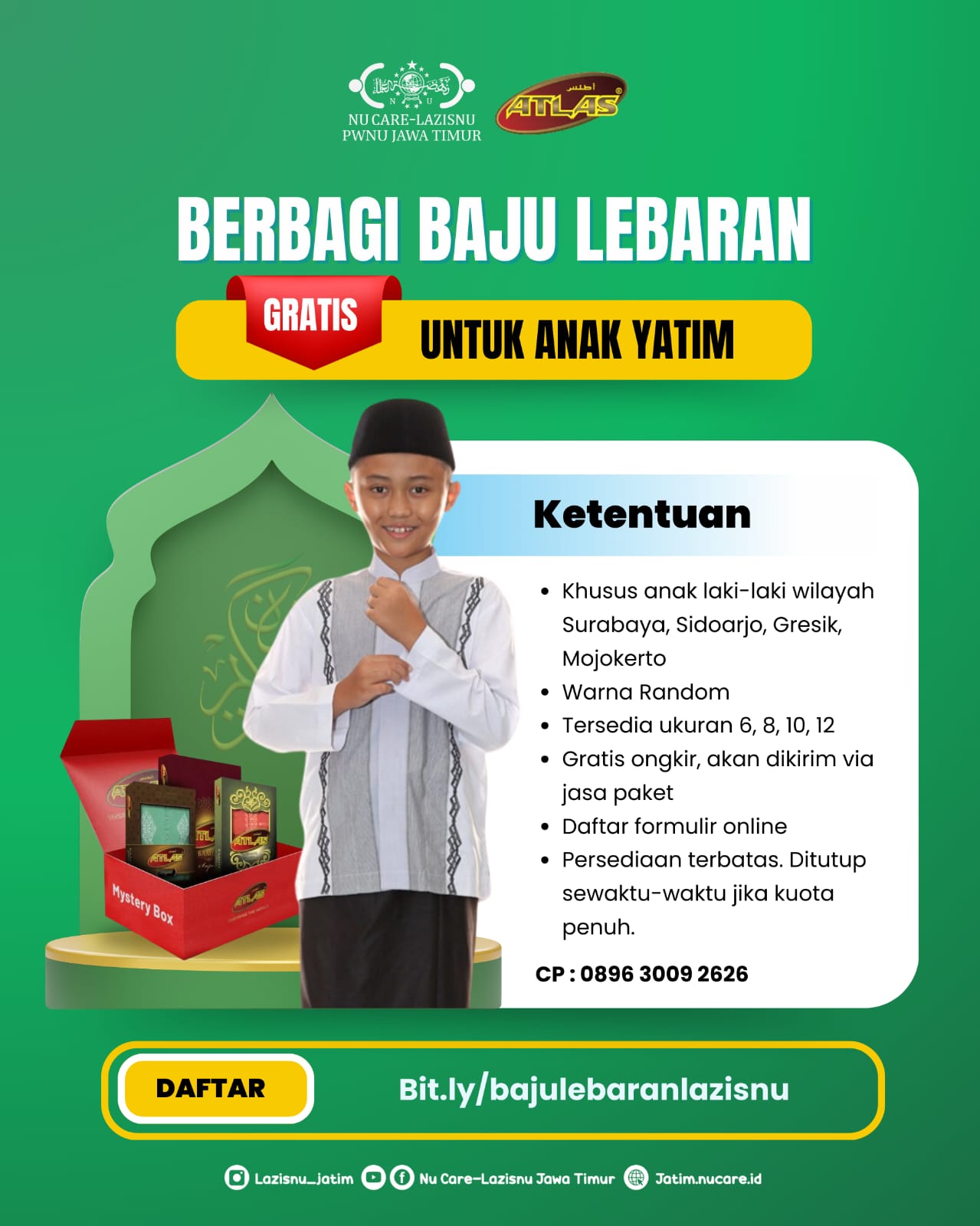 Surabaya, – Mendekati Hari Raya Idul Fitri 1.445 H, Lembaga Amil Zakat, Infaq dan Shadaqah Nahdlatul Ulama (LAZISNU) Pengurus Wilayah Nahdlatul Ulama (PWNU) Jawa Timur meluncurkan program berbagi baju lebaran untuk anak yatim. Masyarakat dapat mendaftarkan keluarga atau tetangganya untuk mendapat bantuan ini.
