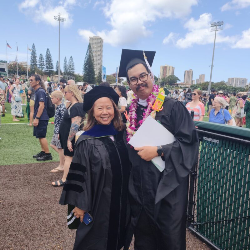 Reza Maulana Hikam bersama Vina Lanzona (kiri) selaku Wakil Ketua Penguji tesisnya di Stan Sheriff Stadium, Honolulu, Hawai, Amerika Serikat University of Hawai‘i at Mānoa, Amerika Serikat, saat pagelaran wisuda ke-114 UH Mānoa,Sabtu (17/5/2025). (foto: dokumen pribadi)