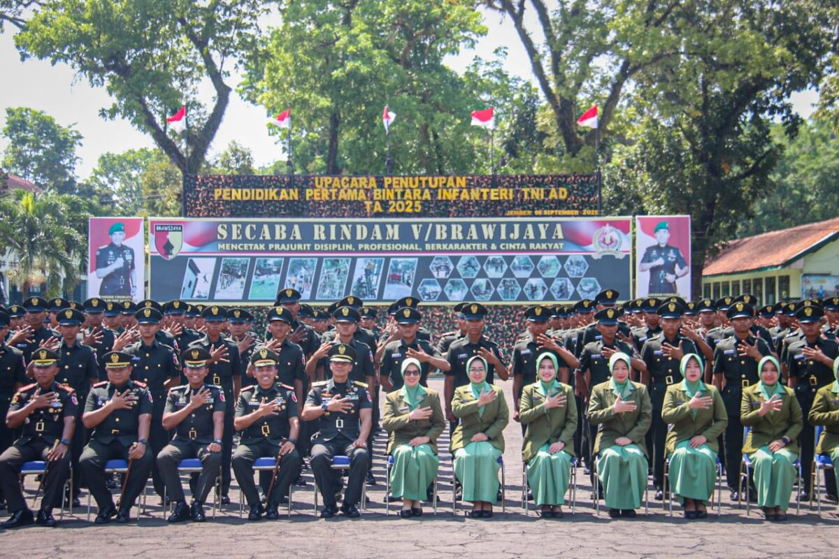 JEMBER, CAKRAWARTA.com – Sebanyak 7.793 prajurit muda resmi dilantik menjadi Bintara TNI Angkatan Darat setelah menuntaskan Pendidikan Pertama Bintara di Secaba Rindam V/Brawijaya, Jember, Jawa Timur. Upacara penutupan pendidikan itu dipimpin langsung oleh Kasdam V/Brawijaya, Brigjen TNI Zainul Bahar, hari ini, Sabtu (6/9/2025).