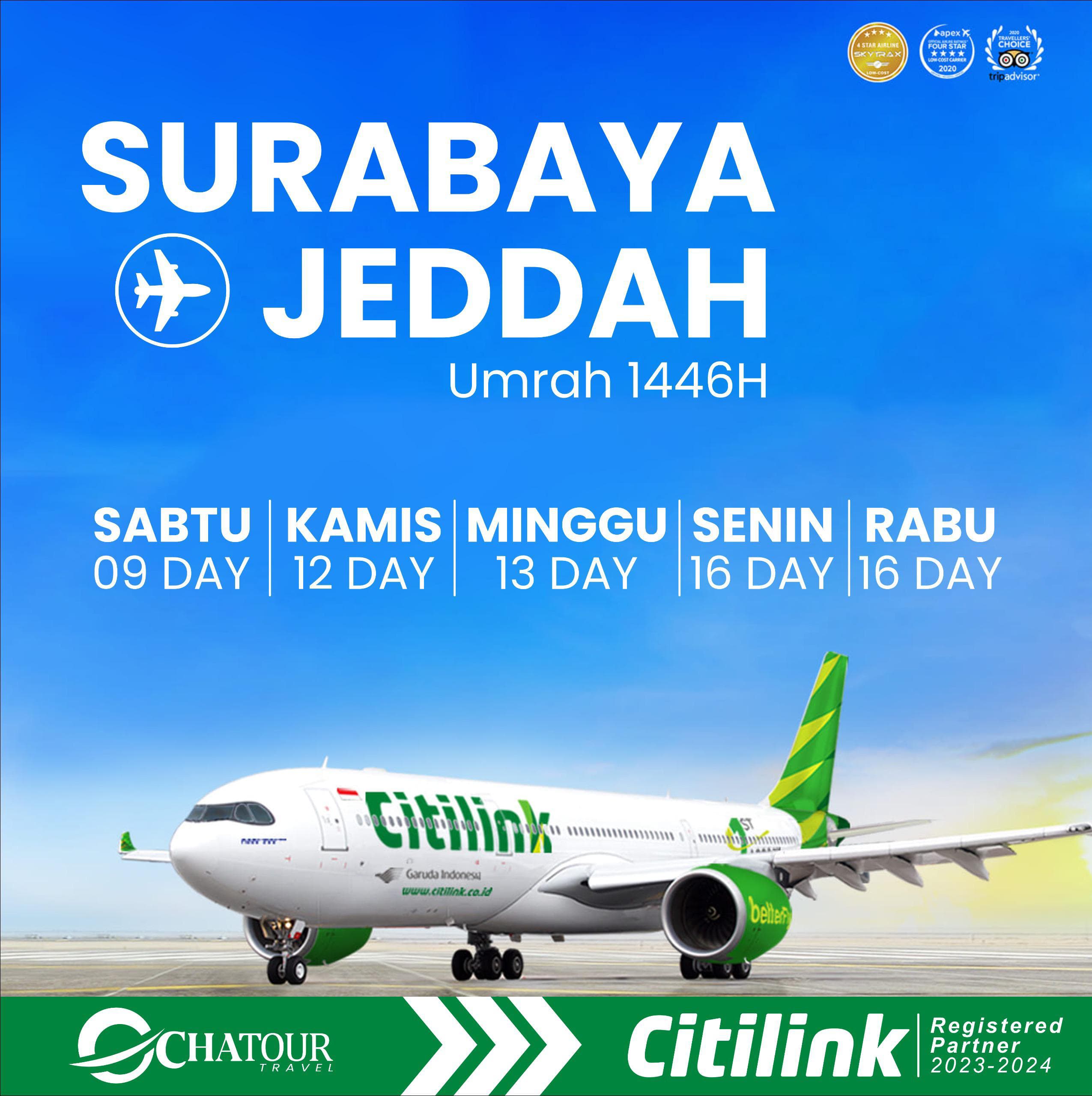 Surabaya, – Biro jasa umrah dan haji “Chatour Travel” (Cemerlang Hajar Aswad Tour and Travel) ditunjuk menjadi partner kerja satu-satunya dari Citilink Indonesia untuk musim umroh 1446 H wilayah Jawa Timur.