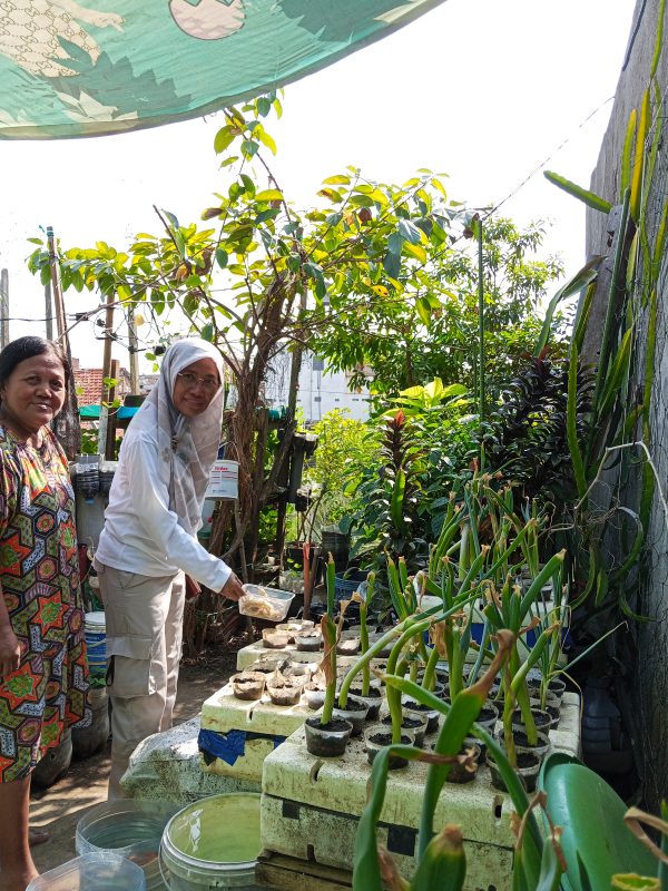 Salah satu sosok yang menjadi sorotan adalah Ibu dan Bapak Siswantoro, warga RT 9 yang sudah bertahun-tahun mengembangkan praktik urban farming di rumahnya. Di lahan sempit depan dan atas rumahnya di lantai 2, mereka menanam sayuran seperti bayam, kangkung, luntas, singkong, bawang merah hingga pepaya. Tapi yang paling menarik perhatian tim juri adalah pupuk kompos yang ia hasilkan sendiri dari limbah kulit pisang yang dikumpulkan dari para pedagang di Pasar Karang Menjangan, tak jauh dari rumahnya.