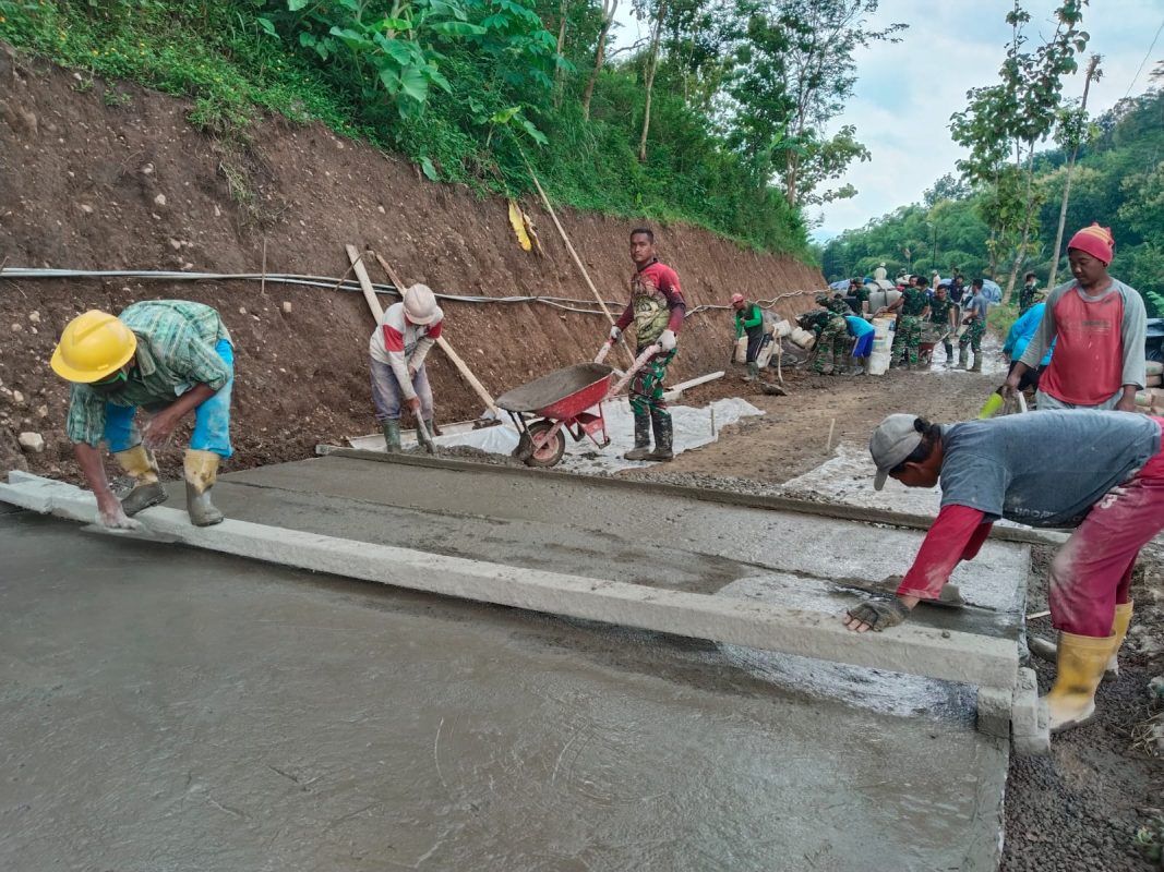 Senin (23/2/2026), personel TNI dan warga tampak bahu-membahu memperkeras dan merapikan badan jalan sepanjang 500 meter dengan lebar 4 meter. Jalan tersebut menjadi penghubung penting antarwilayah permukiman dan jalur utama distribusi hasil pertanian warga.