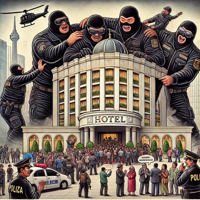 Lalu, saat segerombolan orang menyerang melalui pintu belakang hotel —ya, pintu belakang, seperti adegan mata-mata di film— polisi bikin alibi. Dalam jumpa pers, mereka mengaku sadar bahwa mereka kecolongan.