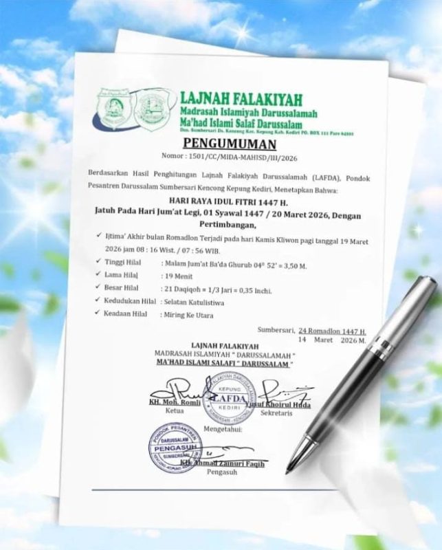 “Pimpinan Pondok Modern Darussalam Gontor memaklumkan bahwa Hari Raya Idul Fitri 1447 H di PMDG jatuh pada Jumat, 1 Syawal 1447/20 Maret 2026,” demikian bunyi maklumat tersebut.