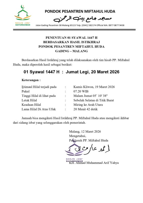 Penetapan serupa juga dilakukan sejumlah pesantren lain. Pondok Pesantren Miftahul Huda, Gading, Malang, melalui hasil istikhraj tim hisab menetapkan 1 Syawal 1447 H jatuh pada Jumat (20/3/2026).