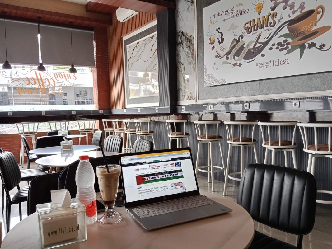 Pilihan tempat duduk pun beragam, termasuk kursi tinggi bergaya kafe internasional yang memberi kesan inklusif dan terbuka, seakan menegaskan bahwa Han’s Coffee adalah ruang lintas latar, lintas kebutuhan. Dengan WiFi stabil dan banyak colokan, kafe ini kerap menjadi tempat mengerjakan tugas, menyelesaikan pekerjaan kantor, hingga berdiskusi santai tanpa rasa tergesa.