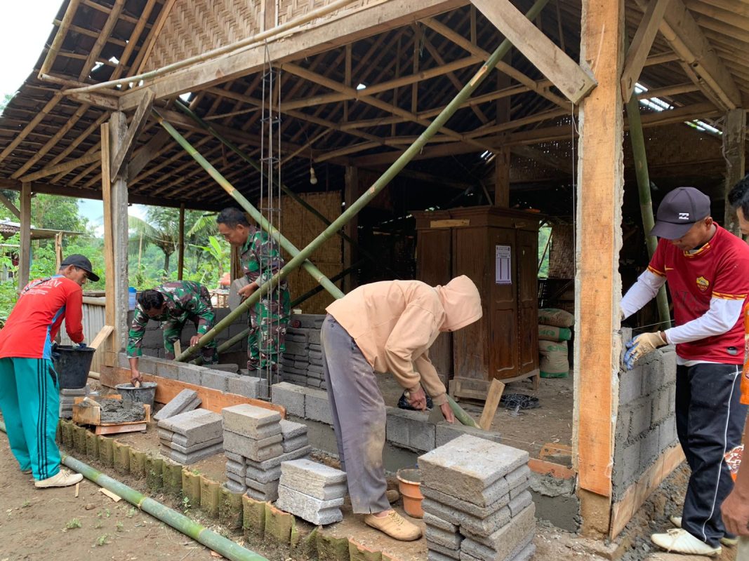 Satgas TMMD ke-127 Kodim 0728/Wonogiri bersama warga sekitar tengah membangun rumah layak untuk Giyanto, warga Dusun Sapatan, Desa Kembang, Kecamatan Wonogiri, Kabupaten Wonogiri, Rabu (25/2/2026). (foto: Agus Kemplu)