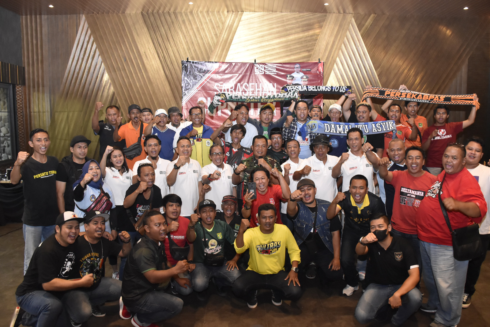 Pangdam V Brawijaya Mayjen TNI Farid Makruf, MA berfoto bersama para suporter sepakbola seluruh Jawa Timur setelah dirinya didapuk sebagai Bapak Suporter Jatim dalam acara Sarasehan Suporter di Hedon Estate Surabaya, Sabtu (4/3/2023). (foto: cakrawarta)