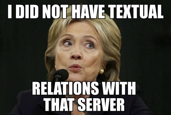 Pernyataan terkenal Bill Clinton itu diplesetkan dalam kasus Hillary dengan kasus kontroversi emailnya. Kini foto Hillary yang dipasang di meme. Teksnya berbunyi persis seperti pernyataan Bill Clinton namun diubah untuk kasus Emal: I Didn’t Have Textual Relation With That Server.