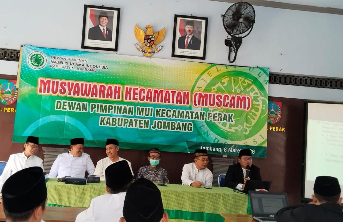 JOMBANG, CAKRAWARTA.com – Musyawarah Kecamatan (Muscam) Majelis Ulama Indonesia (MUI) Kecamatan Perak, Kabupaten Jombang, menetapkan KH M. Haris Munawir sebagai Ketua Dewan Pimpinan MUI Kecamatan Perak periode 2026-2031. Keputusan tersebut dihasilkan melalui musyawarah tim formatur dalam Muscam yang digelar di Pendopo Kecamatan Perak, Minggu (8/3/2026).