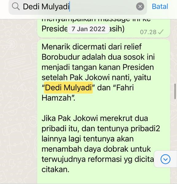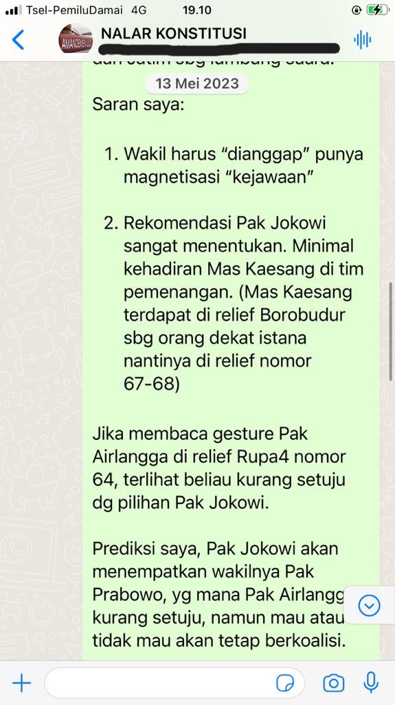Di Grup WA Nalar Konstitusi (yang beranggotakan tokoh-tohoh politik dan orang istana) pada 13 Mei 2023 penulis berharap Presiden Jokowi menempatkan cawapres bagi Prabowo pada pemilu 2024. Sekaligus merekomendasikan masuknya Kaesang di Tim pemenangan. Sebenarnya jauh hari penulis sudah merekomendasikan hal itu, hanya saja, screenshot WA yang dapat diperoleh adalah tertanggal 13 Mei 2023.