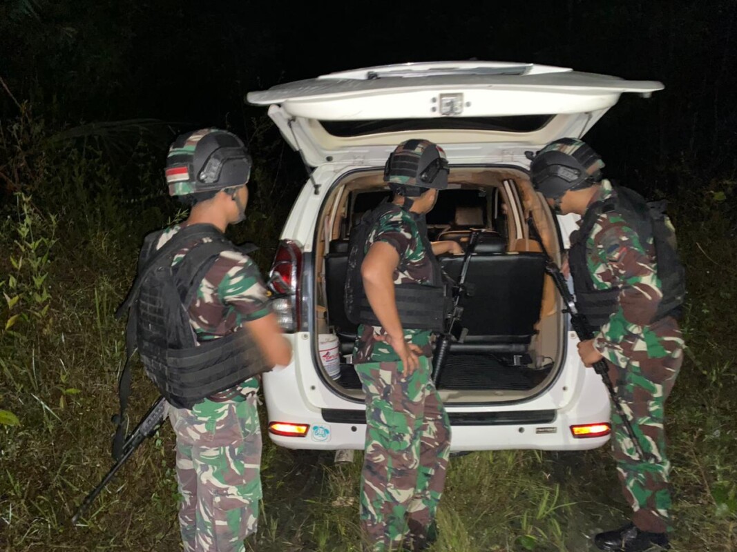 Personel Satgas Yonif 122/TS saat mengamankan mobil terduga pelaku upaya penyelundupan berupa 1,5kg ganja di perbatasan RI-PNG, Senin (20/5/2024). (foto: yonif 122/TS)