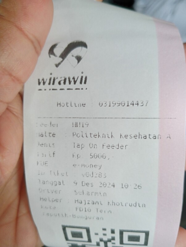 “Jadi kalau masnya tadi naik di Poltekes Kemenkes pakai Wira-Wiri lalu mau lanjut ke tujuan lain, selama masih dalam rute, bisa pindah ke Suroboyo Bus ga usah bayar lagi. Tapi tiketnya jangan lupa ditunjukkan. Jadi jaga baik-baiknya tiket untuk bukti,” tandasnya.