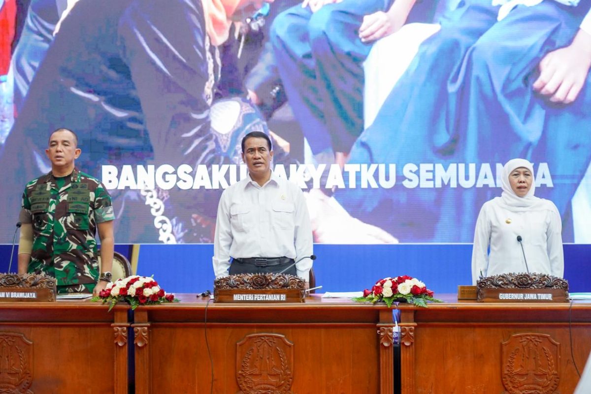 Kiri-kanan: Pangdam V/Brawijaya Mayjen TNI Rudy Saladin, Menteri Pertanian Amran Sulaiman dan Gubernur Jawa Timur Khofifah Indar Parawansa saat menghadiri Rapat Koordinasi Nasional Percepatan Hilirisasi Perkebunan di Gedung Negara Grahadi, Surabaya, Selasa (23/12/2025). (foto: Pendam V/Brw for Cakrawarta)