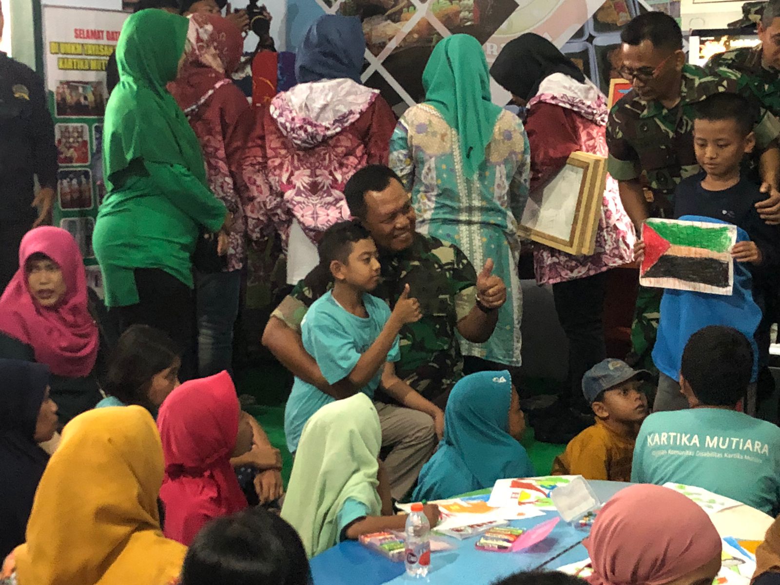 Dalam kesempatan itu, Pangdam Brawijaya juga menggendong beberapa disabilitas, memeluknya dan berbincang dengan mereka soal hasil gambar mereka. Ada seorang disabilitas autisme bernama Zian menggambar bendera Palestina.