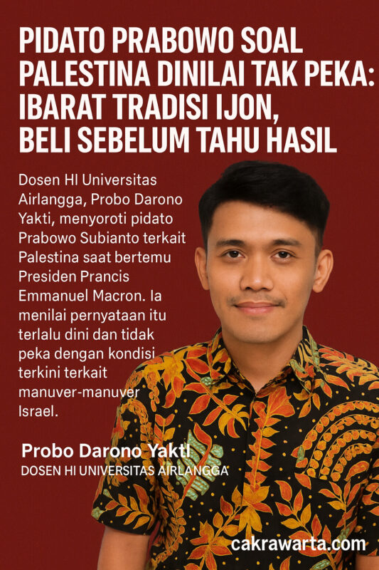 SURABAYA, CAKRAWARTA.com – Pidato Prabowo Subianto dalam pertemuannya dengan Presiden Prancis Emmanuel Macron di Istana Negara beberapa waktu lalu, memantik kritik tajam dari akademisi. Dosen Hubungan Internasional Universitas Airlangga, Probo Darono Yakti, menyebut pernyataan Prabowo sebagai langkah komunikasi politik yang keliru, tidak sensitif, dan mengabaikan etika dasar nilai-nilai kemanusiaan universal.