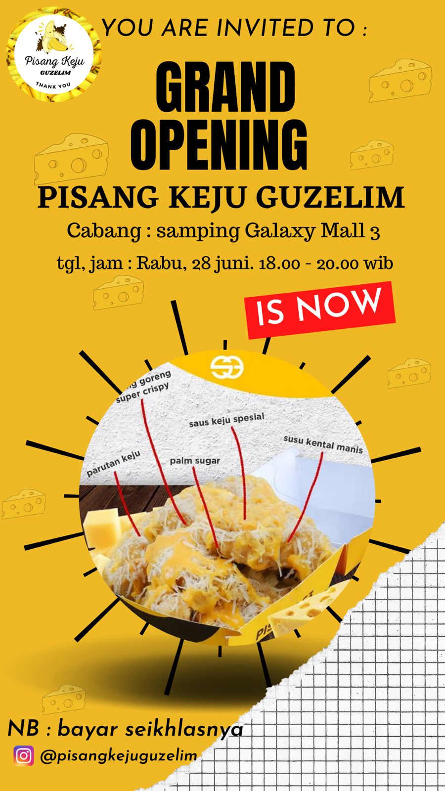 “Lokasi kami tepatnya di samping Galaxy Mall 3. Depan ruko-ruko. Pisang Keju Guzelim merupakan gerai pisang keju pertama di sepanjang jalan MERR Surabaya,” tukasnya.