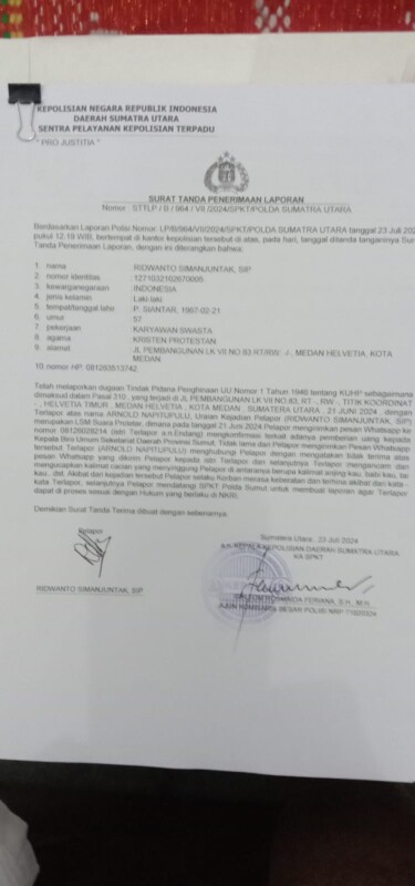Lebih lanjut, ketua LSM SUARA PROLETAR menyatakan bahwa laporan tersebut tertuang pada Surat Tanda Penerimaan Laporan Nomor: STTLP/B/964/VII/2024/SPKT/POLDA SUMATERA UTARA.