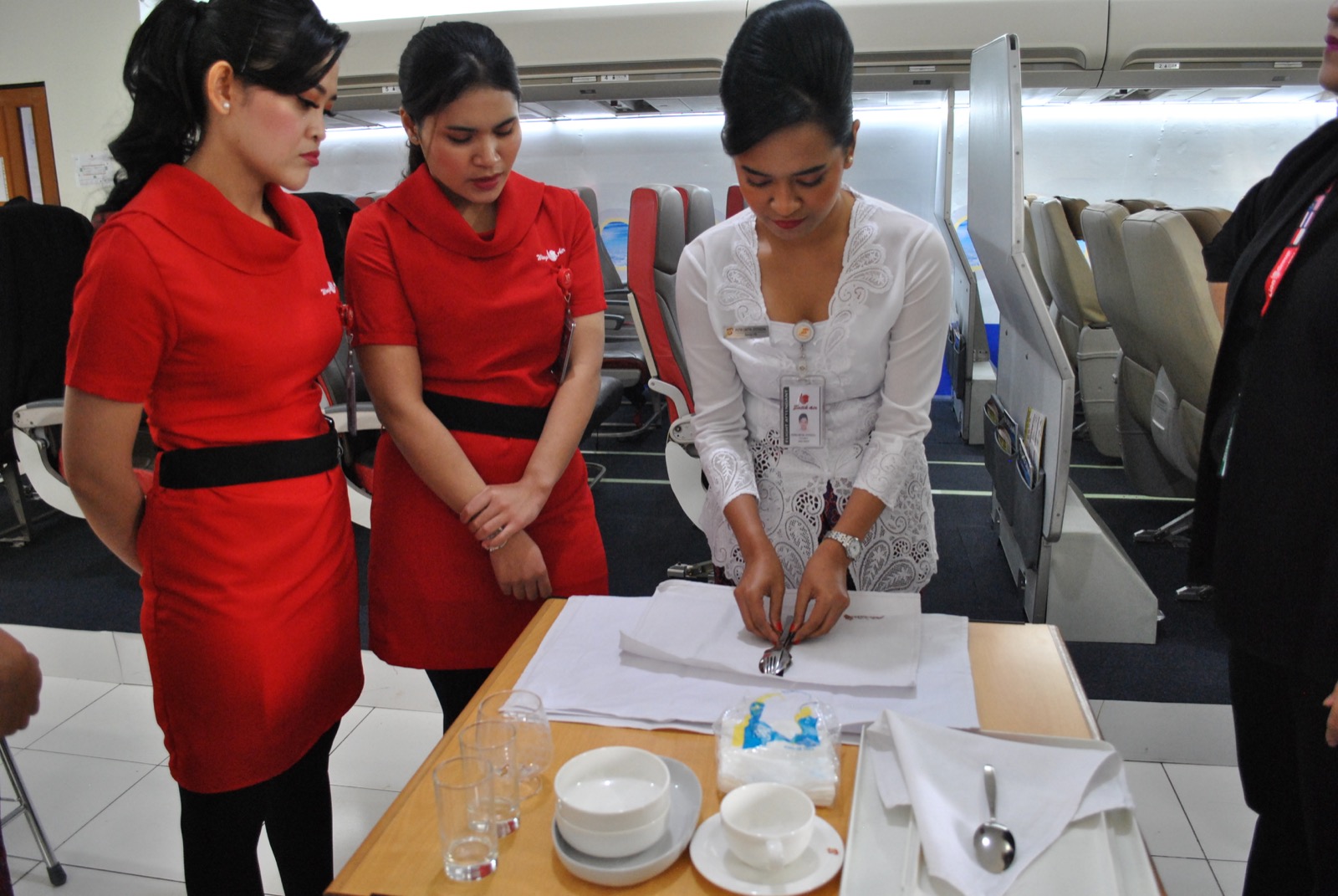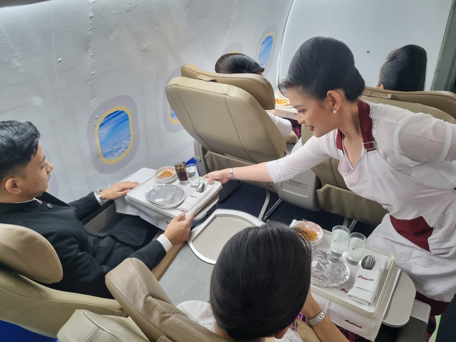 “Pramugari dan pramugara harus menguasai cara menggunakan dan membersihkan alat-alat servis setelah pemakaian, serta cara menyajikan makanan dan minuman kepada penumpang secara higienis dan ramah,” ujar Danang.Yang tak kalah penting adalah Emergency Window, yang berfungsi sebagai sarana evakuasi darurat, sama seperti pintu darurat dan hanya digunakan dalam keadaan darurat saja.