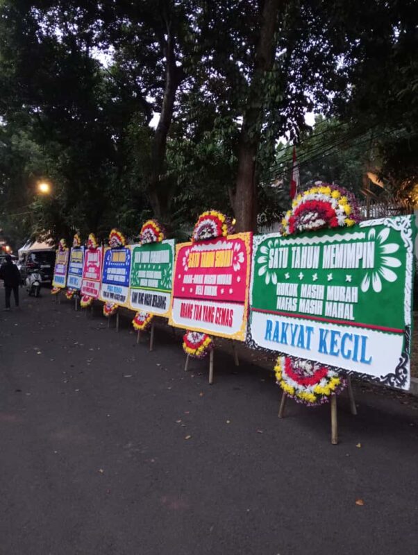 JAKARTA, CAKRAWARTA.com – Hari ini, Selasa (21/10/2025) pagi, Jalan Kertanegara di Jakarta Selatan tampak lebih berwarna dari biasanya. Deretan karangan bunga berdiri rapi di depan rumah pribadi Presiden Prabowo Subianto. Dari jauh tampak seperti ucapan selamat ulang tahun pemerintahan. Tapi jika dibaca lebih dekat, pesannya justru getir yaitu “Sembako makin mahal, rokok makin murah.” dan “Rakyat butuh gizi, bukan rokok.”