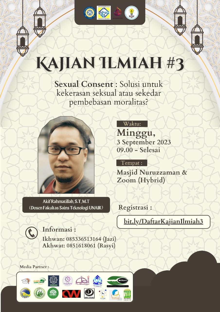 Poster “Kajian Ilmiah #3” bertemakan “Sexual Consent : Solusi untuk Kekerasan Seksual atau Sekadar Pembebasan Moralitas” yang menghadirkan akan Akif Rahmatillah, S.T, M.T dan diselenggarakan oleh UKMKI Unair Surabaya, Minggu (3/9/2023). (foto: cakrawarta)