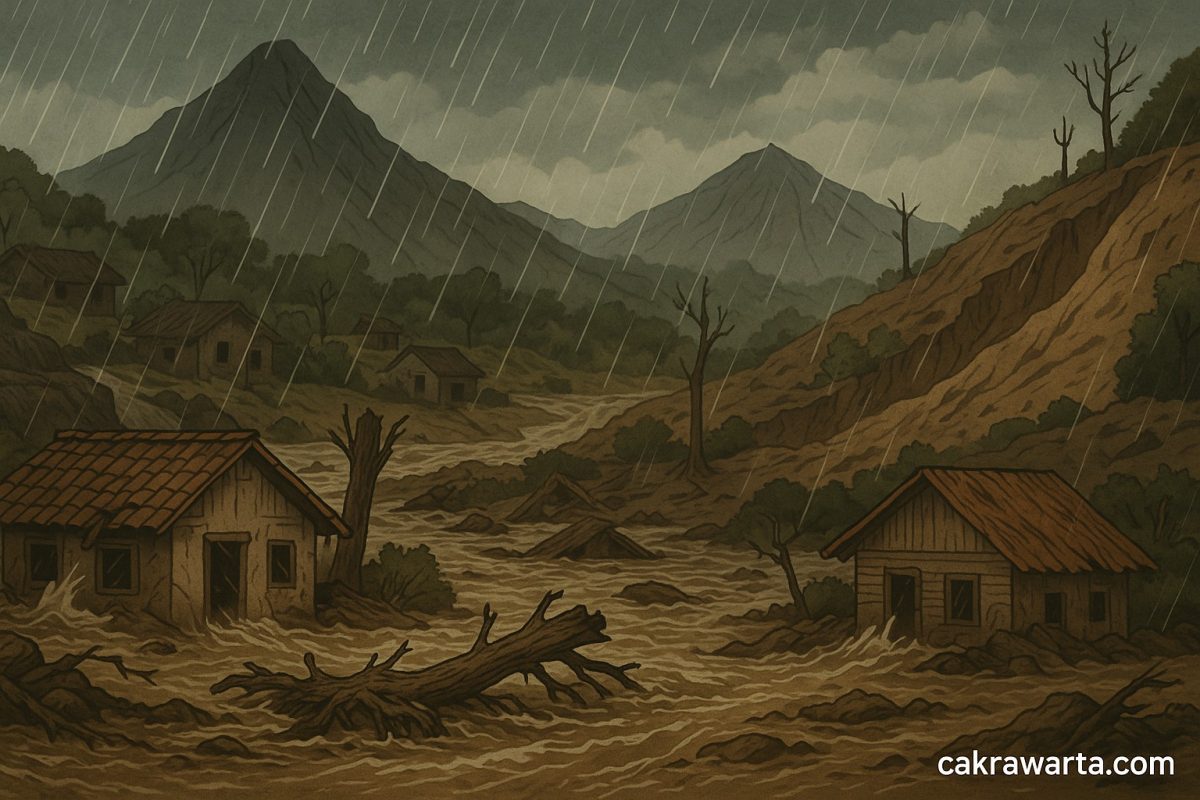 SURABAYA, CAKRAWARTA.com – Rangkaian banjir dan longsor yang melanda Aceh, Sumatra Utara, dan Sumatra Barat dalam beberapa hari terakhir kembali membuka luka lama: rapuhnya relasi manusia dengan alam. Kerusakan meluas, ribuan warga mengungsi, dan pertanyaan publik menguat yaitu apa sebenarnya penyebab bencana ini?