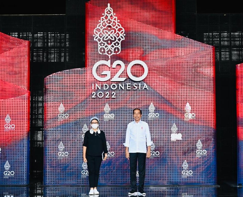 Presiden Joko Widodo dan Menteri Luar Negeri Retno L Marsudi dengan latar panggung acara KTT G20 Bali. Pakar Hubungan Internasional mengatakan manfaat KTT G20 bagi Indonesia memang tidak bisa instan. (foto: setpres)