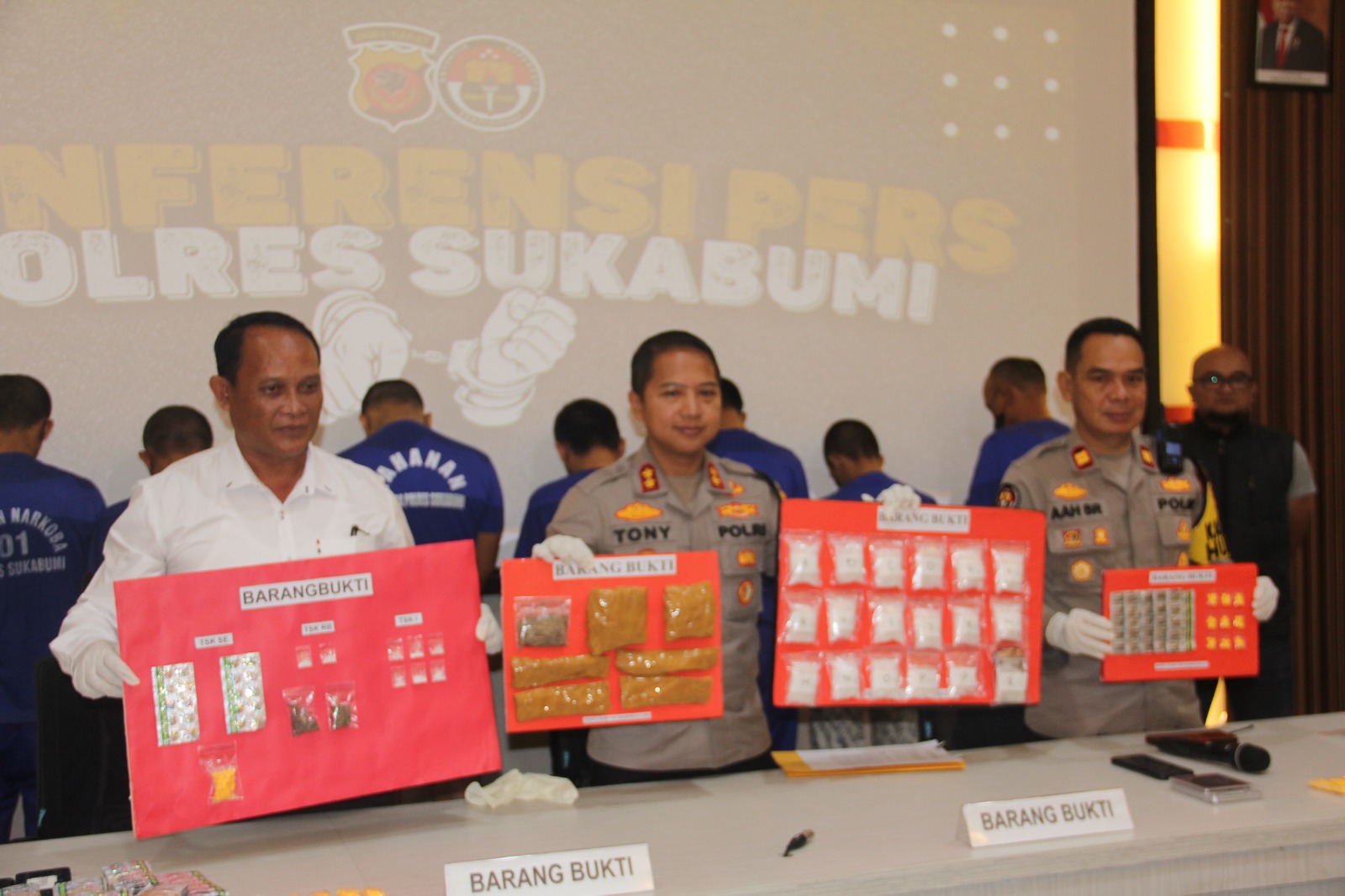 “Kami dengan berhasil menangkap 7 tersangka terkait kasus ini dalam kurun waktu satu bulan terakhir,” ujar Kapolres Sukabumi AKBP Tony Prasetyo dalam konferensi pers yang didampingi oleh beberapa pejabat terkait, seperti Kasat Narkoba Polres Sukabumi AKP Tatang Mulyana dan Kasi Humas Polres Sukabumi Iptu Aah Saepul Rohman.