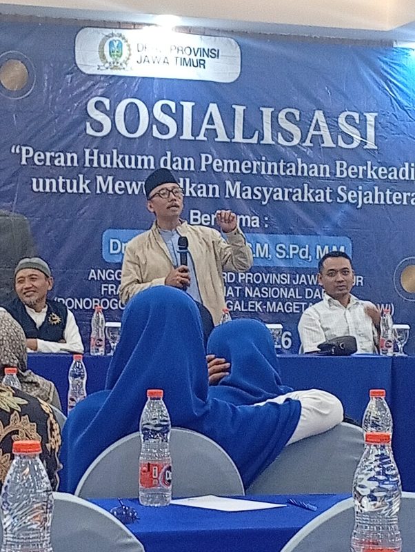 Hal itu disampaikan Suli Da’im dalam kegiatan sosialisasi bertema “Peran Hukum dan Pemerintahan Berkeadilan untuk Mewujudkan Masyarakat Sejahtera” di Hotel Maesa, Ponorogo, Minggu (15/3/2026).