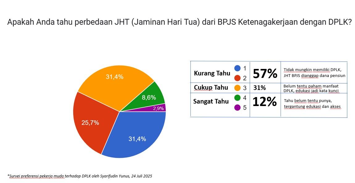 Dari survei tersebut, lanjut Syarifuddin, didapatkan data bahwa 57% responden mengaku “kurang tahu” soal perbedaan DPLK dan JHT BPJS. Lalu sebanyak 31% “tahu”, tapi belum tentu paham manfaat atau memilikinya, dan Hanya 12% yang “sangat tahu”, namun juga belum tentu memiliki DPLK.