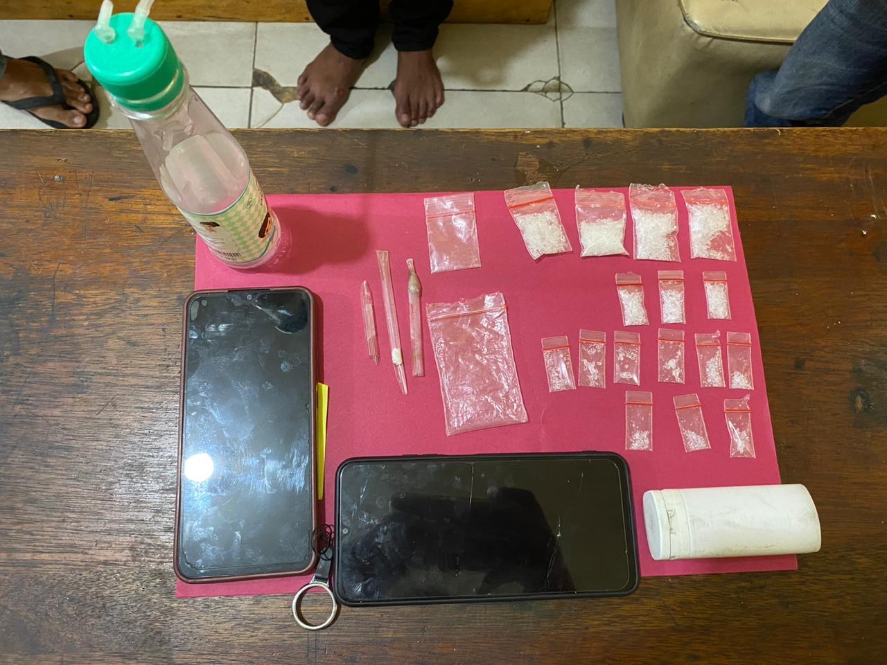 Adapun barang bukti yang diamankan, enam belas bungkus plastik klip bening yang berisi Narkotika jenis shabu, satu set alat hisap shabu, satu buah kaca pirex, satu buah sendok shabu, dua unit Handphone dan satu buah botol plastik.