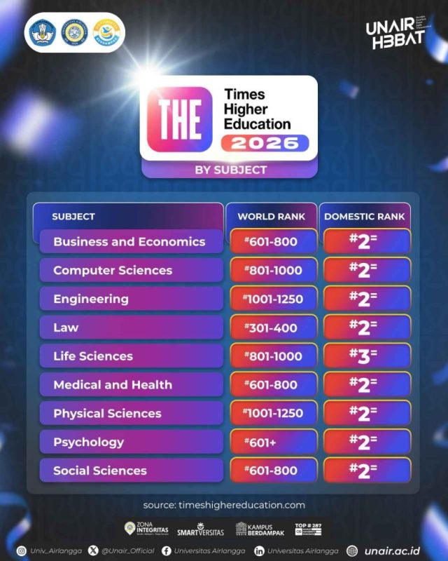 “Pemeringkatan internasional, termasuk THE World University Rankings by Subject, kami jadikan sebagai alat refleksi dan pemetaan kekuatan akademik UNAIR. Hasil ini menjadi dasar untuk perbaikan berkelanjutan,” ujarnya dalam keterangannya pada media ini, Kamis (22/1/2026).
