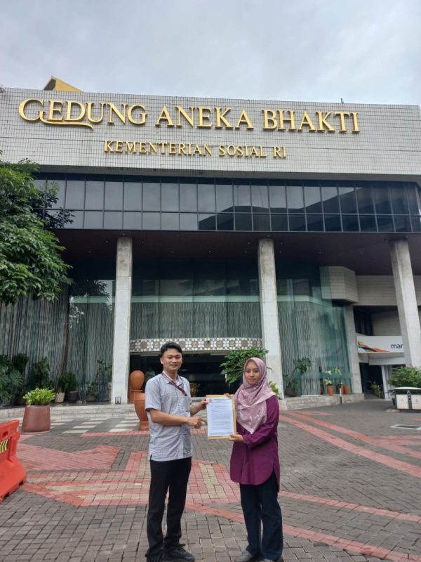 Ketua Niti Emiliana dan Sekjen YLKI Rio Priambodo menunjukkan surat somasi di depan Gedung Kementerian Sosial RI, Jakarta, Senin (9/2/2026). (foto: YLKI untuk Cakrawarta)